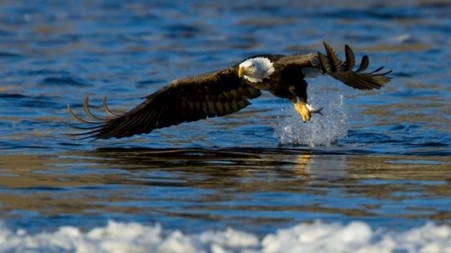 The eagle soars high effortlessly for an extended period of time and on a moments notice quickly descending it powerfully scales the waters of a rapidly running stream that flows a strong current and plucks his tasty catch out of the water.