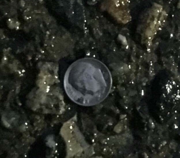 Out for a walk in the crisp soft rain a small shiny piece of metal lies face up in the street.